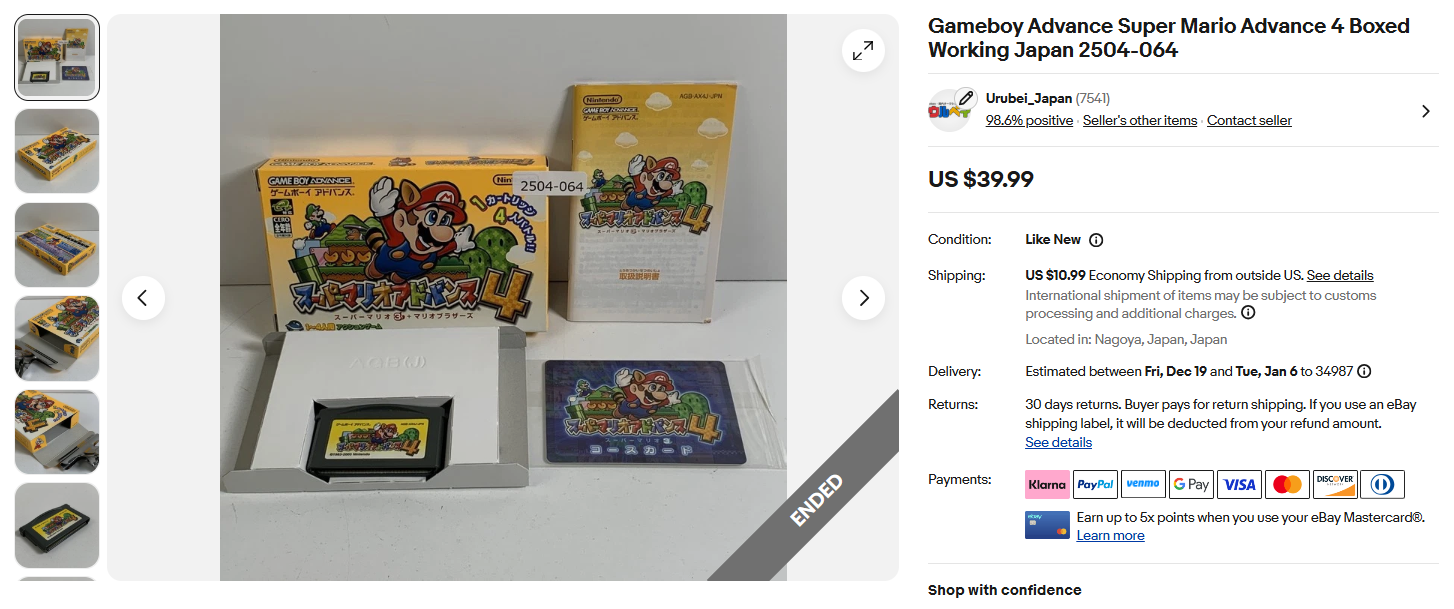 ウルベイ販売実績:自社商品Gameboy Advance Super Mario Advance 4 Boxed Working Japan 2504-064 39.99USD(米ドル)