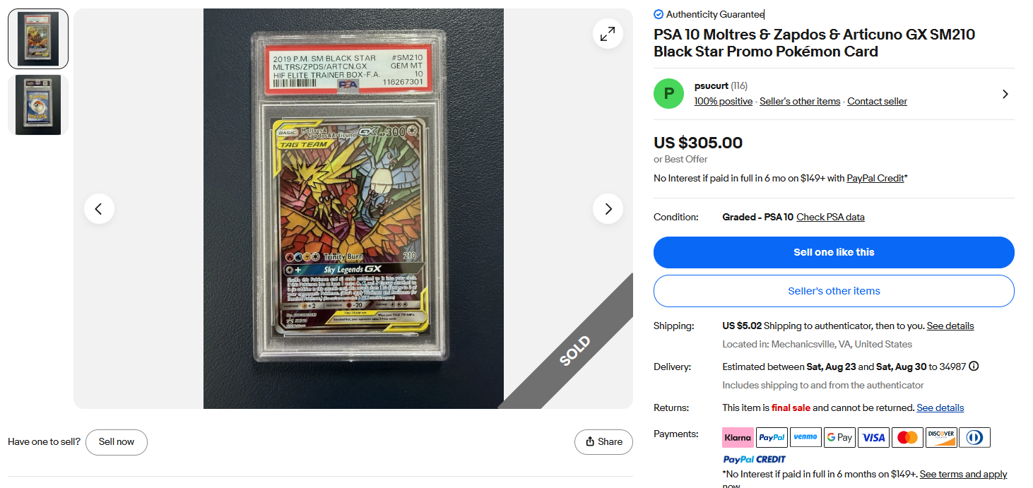 24-U0152 PSA 10 ファイヤー&サンダー&フリーザーGX SM210 ブラックスター プロモ ポケモンカード 305ドル ebayで売れてます
