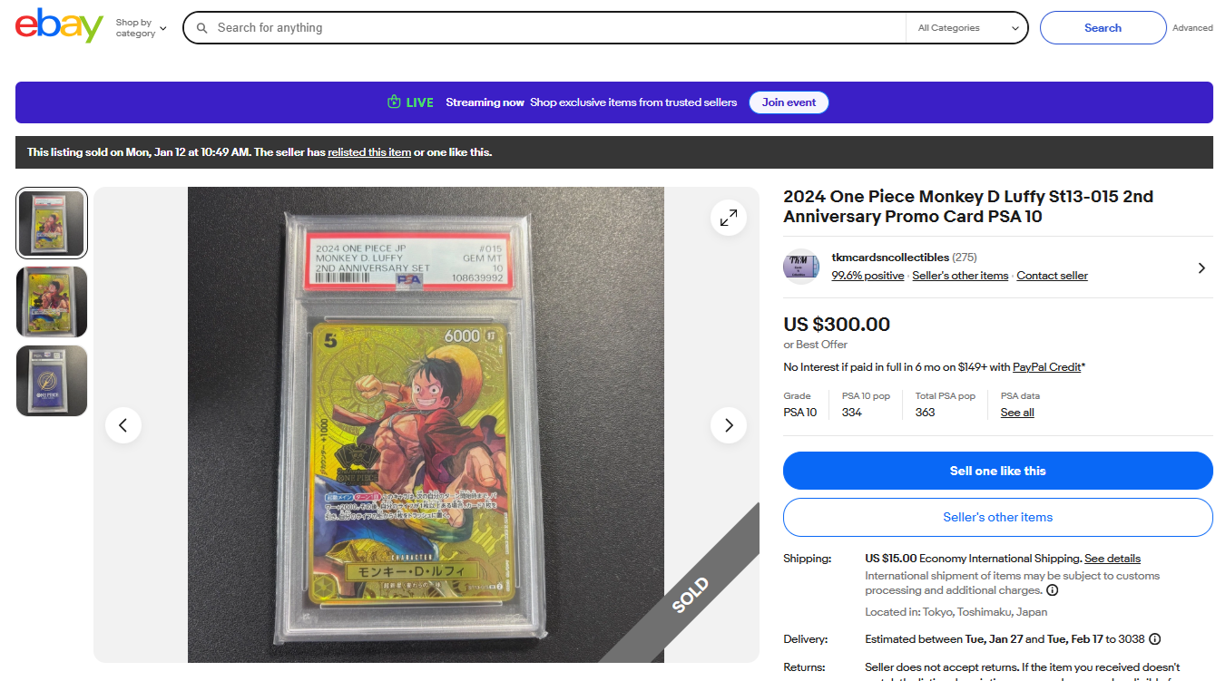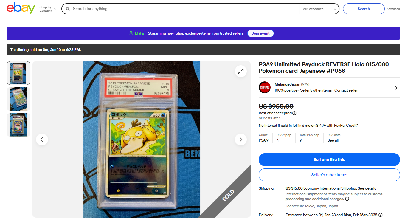 ebayで売れている商品 24-U0195 PSA 10 ピカチュウ 長場雄 × PCG キャンペーン 208/S-P プロモ ポケモンカード 2021 ジェム 新品同様 223ドル ebayで売れてます