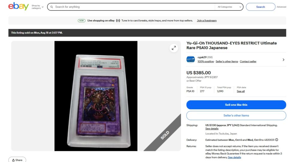 今回はこちらの商品がebayで売れました。 ※販売日より90日が経過しますとURL閲覧は不可となります。 □ご依頼者様:千葉県A様 □商品タイトル:PSA10 PHONE CARDPOP1 ! 2019 Fate 15T...