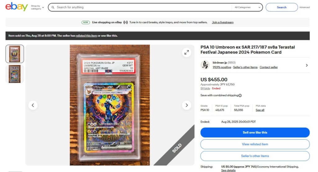 本日はこちらのポケモンカード商品の紹介です。 ebayではこんな「トレカ」商品についても高値で取引されております! ●商品名 PSA 10 Umbreon ex SAR 217/187 sv8a Teras...