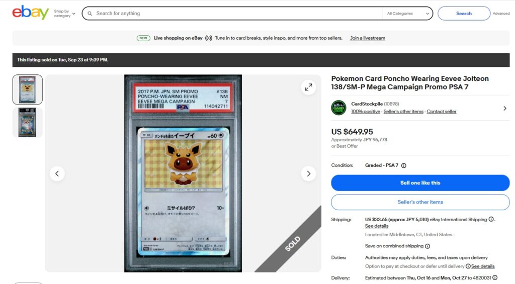 本日はこちらのポケモンカード商品の紹介です。 ebayではこんな「トレカ」商品についても高値で取引されております! ●商品名 Pokemon Card Poncho Wearing Eevee Jolteo...