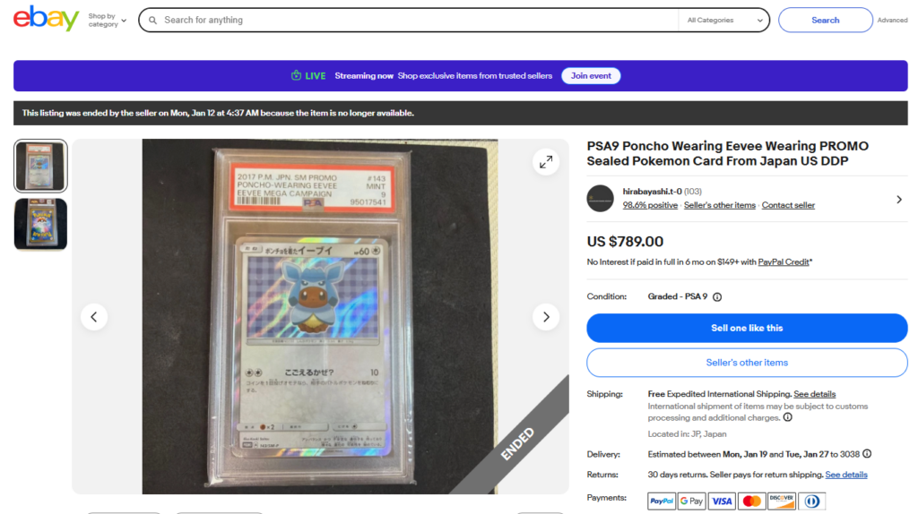 本日はこちらのポケモンカード商品の紹介です。 ebayではこんな「トレカ」商品についても高値で取引されております! ●商品名 PSA9 Poncho Wearing Eevee Wearing PROMO ...