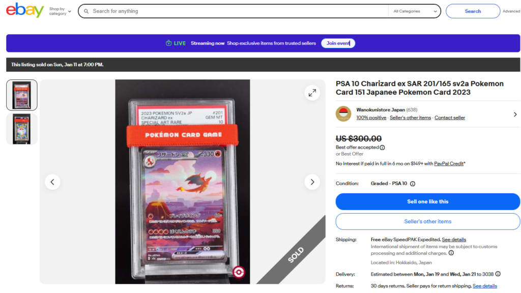 本日はこちらのポケモンカード商品の紹介です。 ebayではこんな「トレカ」商品についても高値で取引されております! ●商品名 PSA 10 Charizard ex SAR 201/165 sv2a Pok...