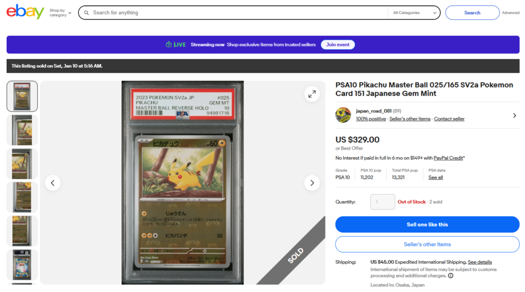 本日はこちらのポケモンカード商品の紹介です。 ebayではこんな「トレカ」商品についても高値で取引されております! ●商品名 PSA10 Pikachu Master Ball 025/165 SV2a P...