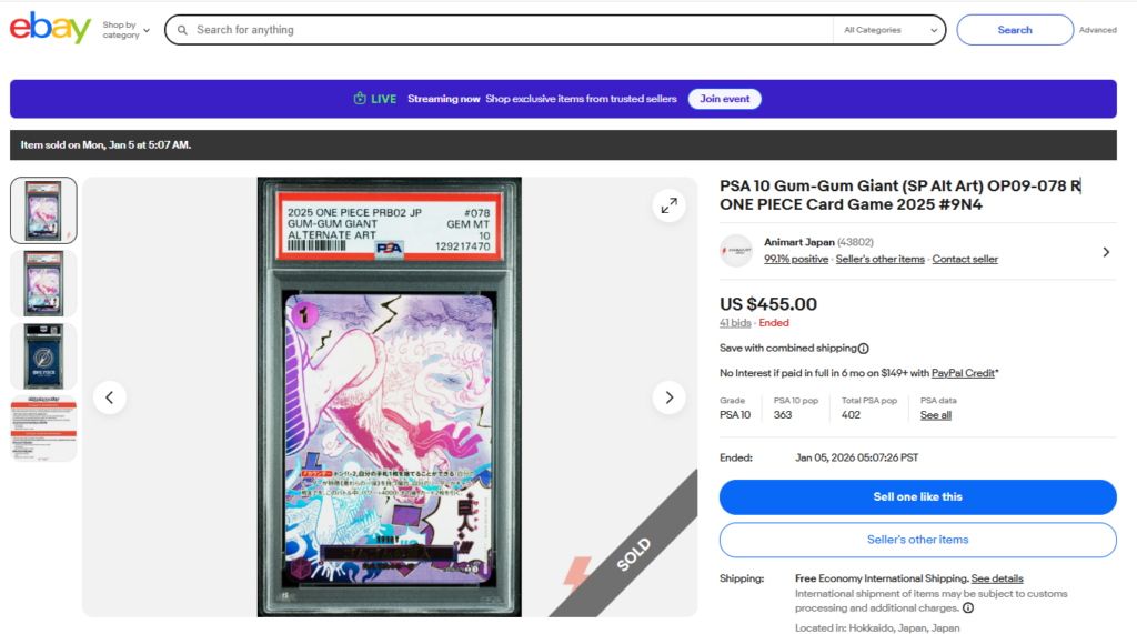 本日はこちらのポケモンカード商品の紹介です。 ebayではこんな「トレカ」商品についても高値で取引されております! ●商品名 PSA 10 Gum-Gum Giant (SP Alt Art) OP09-078 R ON...