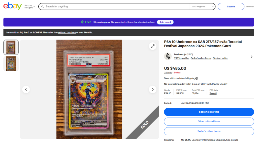 本日はこちらのポケモンカード商品の紹介です。 ebayではこんな「トレカ」商品についても高値で取引されております! ●商品名 PSA 10 Umbreon ex SAR 217/187 sv8a Teras PSA 10...