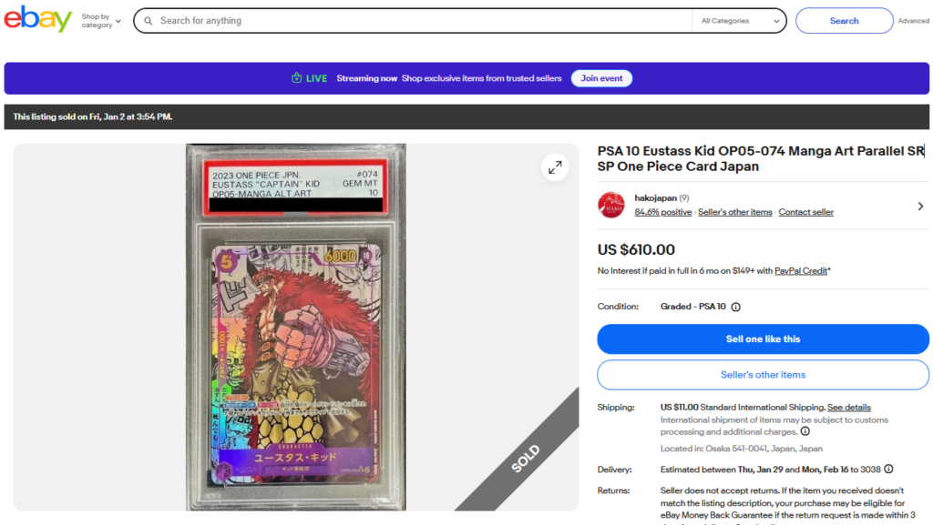 本日はこちらのポケモンカード商品の紹介です。 ebayではこんな「トレカ」商品についても高値で取引されております! ●商品名 PSA 10 Eustass Kid OP05-074 Manga Art Pa...