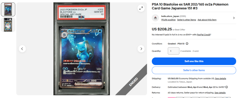 本日はこちらのポケモンカード商品の紹介です。 ebayではこんな「トレカ」商品についても高値で取引されております! ●商品名 PSA 10 Blastoise ex SAR 202/165 sv2a Pok...