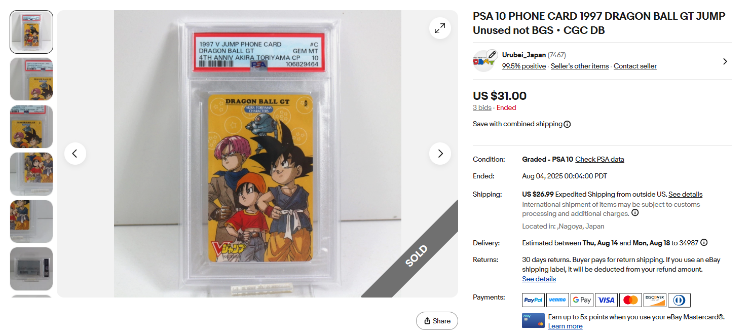 ウルベイ販売実績:千葉県A様PSA 10 PHONE CARD 1997 DRAGON BALL GT JUMP Unused not BGS・CGC DB 31USD(米ドル)