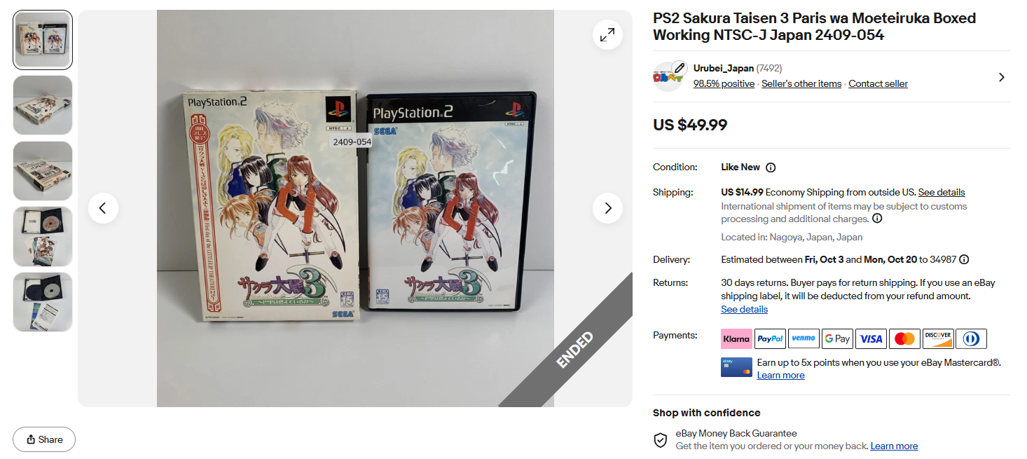 ウルベイ販売実績:自社商品PS2 Sakura Taisen 3 Paris wa Moeteiruka Boxed Working NTSC-J Japan 2409-054 49.99USD(米ドル)
