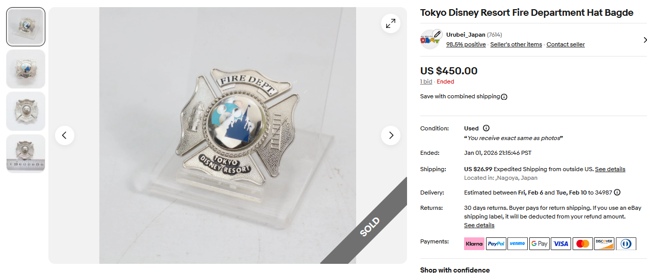ウルベイ販売実績:東京都I様Tokyo Disney Resort Fire Department Hat Bagde 450USD(米ドル)