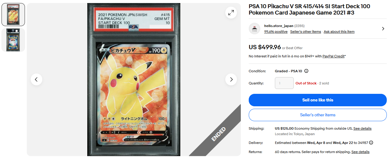 ebayで売れている商品 24-U0218 PSA 10 ピカチュウV SR 415/414 SI スタートデッキ 100 ポケモンカード 日本語ゲーム 2021 #3 499.96ドル ebayで売れてます