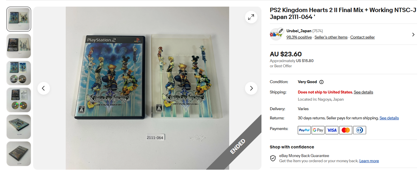 ウルベイ販売実績:自社商品PS2 Kingdom Hearts 2 II Final Mix + Working NTSC-J Japan 2111-064 ' 23.97AUD(オーストラリアドル)
