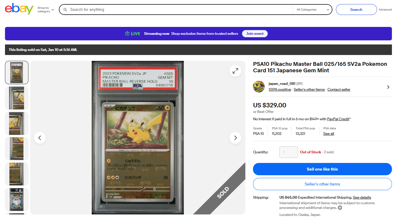 24-U0204 PSA10 ピカチュウ マスターボール 025/165 SV2a ポケモンカード 151 日本製 ジェムミント 329ドル ebayで売れてます